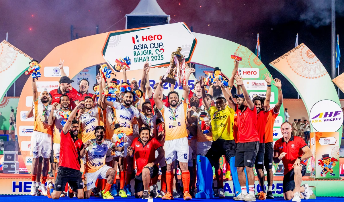 भारतीय पुरुष हॉकी टीम ने रविवार को राजगीर स्पोर्ट्स कॉम्प्लेक्स में कोरिया को 4-1 से हराकर हीरो एशिया कप राजगीर, बिहार 2025 का खिताब अपने नाम किया। स्टेडियम दर्शकों से खचाखच भरा हुआ था और स्थानीय लोग टीम को जोरदार समर्थन देने पहुंचे थे। इस जीत के साथ भारत ने एशिया में अपनी सत्ताधारी स्थिति वापस हासिल कर आठ वर्षों का इंतजार समाप्त कर लिया। साथ ही, भारत एफआईएच पुरुष हॉकी विश्व कप 2026 (नीदरलैंड और बेल्जियम में) के लिए क्वालीफाई कर गया।
