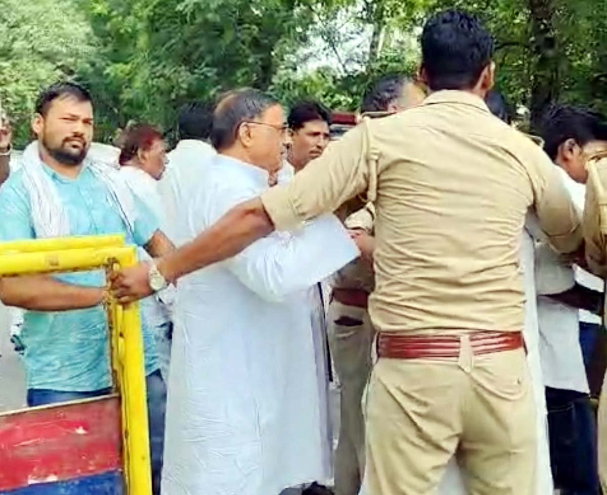 बैरीकेट्स पर प्रतिनिधि मंडल को रोकती पुलिस।