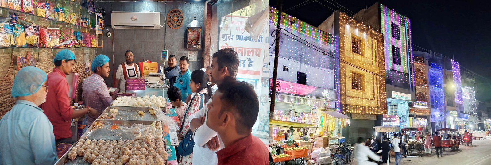 मुखलाल स्वीट हाउस में खरीदारी करते लोग एवं विद्युत झालरों से सजे शहर के भवन।