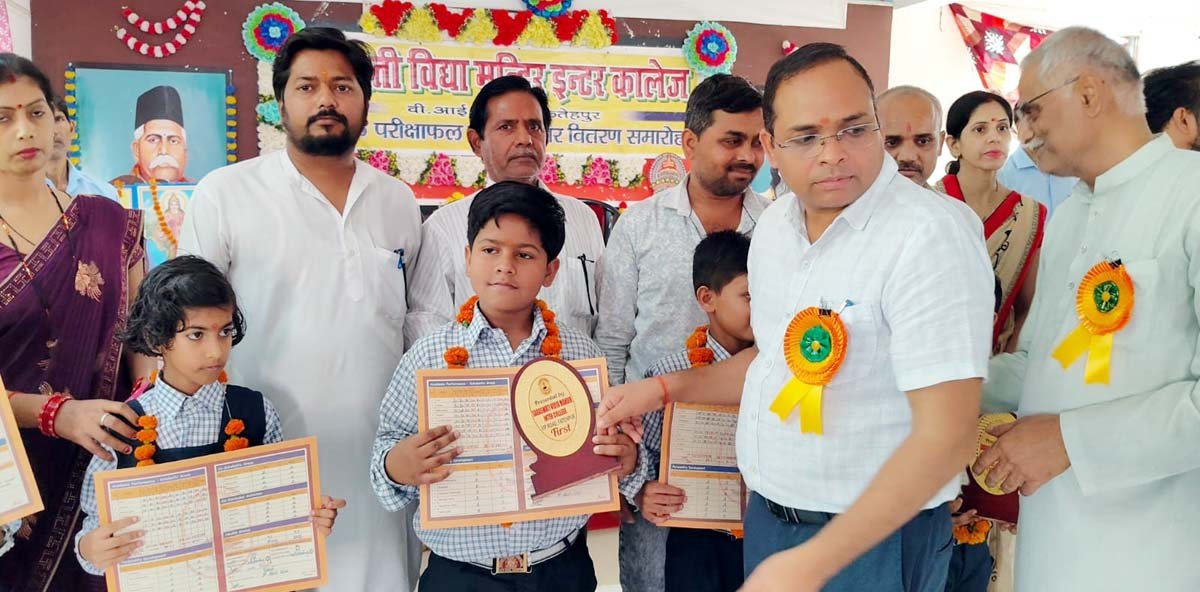 समारोह में राजकीय विद्यालय के प्रधानाचार्य रमाकांत गुप्ता, आरएसएस (घुमंतू प्रमुख) व कमेटी सदस्य संतलाल, विद्यालय के प्रबंधक राकेश श्रीवास्तव एवं कोषाध्यक्ष अजय कुमार मिश्र, सर्व व्यवस्था प्रमुख राजनारायण एवं अंग्रेजी माध्यम व्यवस्था प्रमुख भावना, हिंदी माध्यम व्यवस्था प्रमुख सुशील एवं अन्य सभी आचार्य बन्धु उपस्थित रहे। विद्यालय के प्रधानाचार्य नरेंद्र सिंह ने सभी आगंतुकों का स्वागत किया। परीक्षाफल वितरण की शुरुआत हिंदी माध्यम के छात्र-छात्राओं से की गई। हिंदी माध्यम (प्राइमरी) में संस्कृति शुक्ला ने 96.25 प्रतिशत अंक प्राप्त कर प्रथम स्थान हासिल किया। प्री-प्राइमरी में यशस्वी कैथल ने 99.36 प्रतिशत अंक, अंग्रेजी माध्यम के प्राइमरी वर्ग में पर्व शुक्ला और प्रांजल पाल ने प्रथम स्थान प्राप्त कर अपनी प्रतिभा का लोहा मनवाया। राजकीय विद्यालय के प्रधानाचार्य रमाकांत गुप्ता ने बच्चों को संबोधित करते हुए कहा कि परीक्षाफल केवल अंकों का दस्तावेज नहीं, बल्कि निरंतर सीखने की प्रक्रिया का एक पड़ाव है। प्रधानाचार्य नरेंद्र सिंह ने बच्चों की लगन की सराहना की और इस सफलता का श्रेय अभिभावकों के सहयोग और शिक्षकों के मार्गदर्शन को दिया। अंत में सभी सफल छात्र-छात्राओं को पुरस्कृत किया गया और आगामी सत्र के लिए शुभकामनाओं के साथ सभा का समापन हुआ।