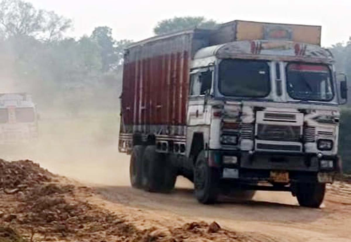 कामचलाऊ रास्ते से निकलता ट्रक।