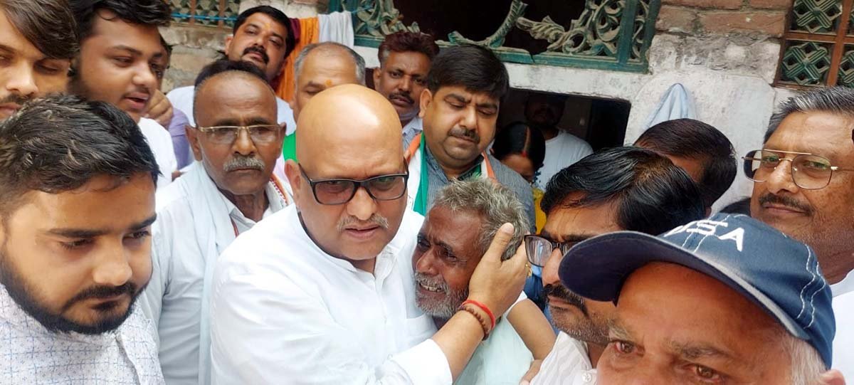 मृतक युवक के पिता को गले लगाकर ढाढंस बंधाते कांग्रेस प्रदेश अध्यक्ष अजय राय।