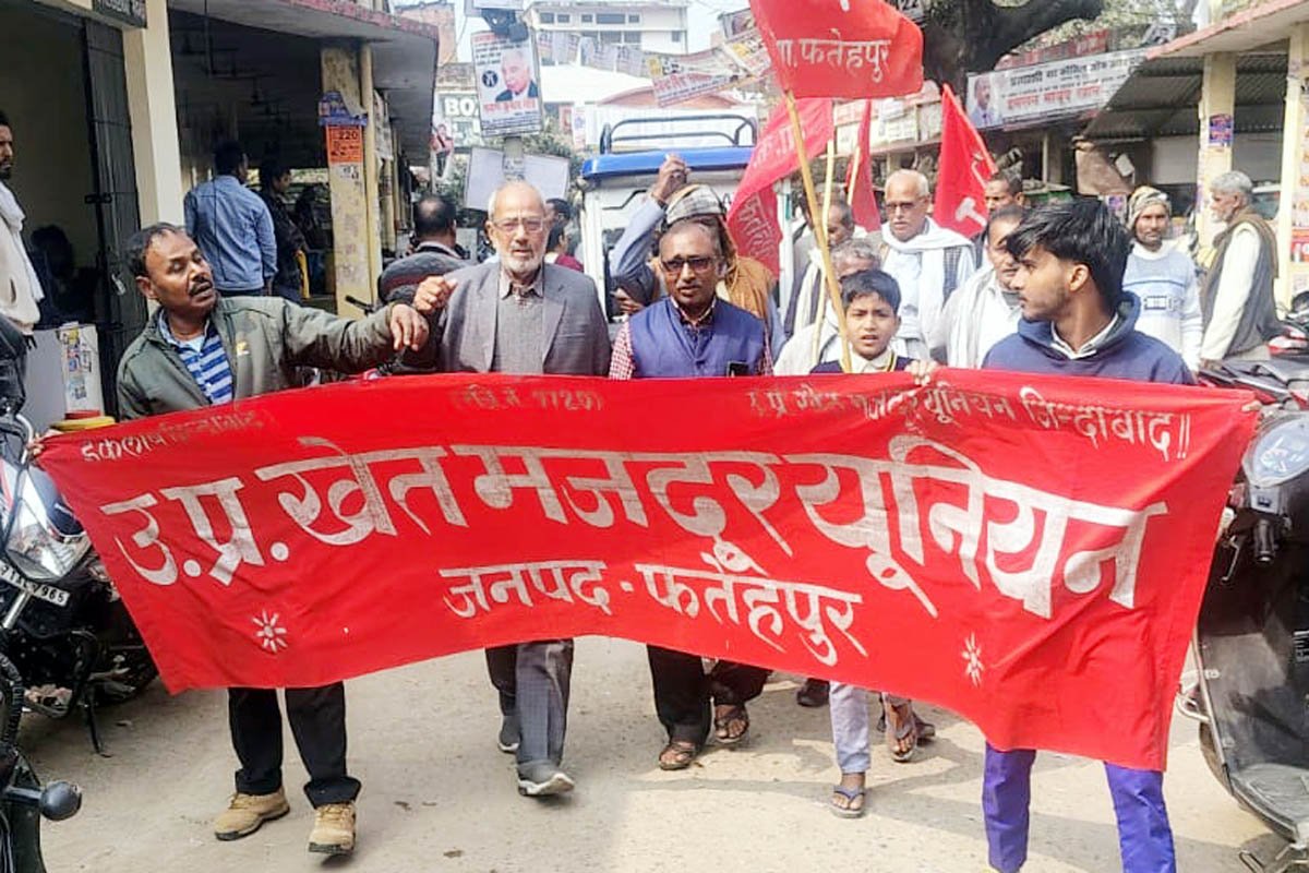 खागा, फतेहपुर(CNF)। उत्तर प्रदेश खेत मजदूर यूनियन ने राष्ट्रीय आंदोलन के तहत तहसील परिसर में प्रदर्शन करने के पश्चात 13 सूत्रीय ज्ञापन उप जिलाधिकारी के माध्यम से राष्ट्रपति को भेजा। जिलाध्यक्ष सुमन सिंह चैहान व जिला महामंत्री कामरेड रामकृष्ण हेगड़े के नेतृत्व में सैकड़ो कार्यकर्ताओं ने तहसील परिसर में प्रदर्शन करके ज्ञापन सौंपा। मांग की गई कि बीबी जी राम जी विधायक वापस लिया जाए और मनरेगा को उसके पुराने स्वरूप में बहाल किया जाए, मनरेगा के तहत मजदूरों को 200 दिन का काम और 700 दैनिक मजदूरी दी जाए, सभी खेत मजदूर को 55 वर्ष की उम्र पूरी हो जाने के बाद 10000 मासिक पेंशन दी जाए, मनरेगा के बचत को भारत सरकार और प्रांतीय सरकार द्वारा दिए जाने वाले पुरानी बजट व्यवस्था को जारी रखा जाए, खेत मजदूरों, दलितों, आदिवासियो,ं पिछड़ो,ं अल्पसंख्यकों, महिलाओं को सामाजिक सुरक्षा की गारंटी दी जाए, खेत मजदूर व ग्रामीण मजदूर आदिवासियों के प्राकृतिक संसाधनों जल जंगल जमीन को अभिलंब वापस किया जाए, खेत मजदूर को कम न मिलने पर मुआवजा दिया जाना सुनिश्चित किया जाए, आजादी के महानायक राष्ट्रपिता महात्मा गांधी के नाम पर चल रहे मनरेगा एक्ट को लागू करते हुए भाजपा सरकार के हिंदू राष्ट्र बनाने की तरफ आगे बढ़ते हुए कदमों को रोका जाए इसके अलावा अन्य मांगे भी शामिल रहीं। ज्ञापन देने वालों में फूलचंद पाल, छोटेलाल, राजेंद्र हंस, हरिश्चंद्र, प्रेम कुमार, अशोक कुमार, बद्री प्रसाद, कयामुद्दीन सहित तमाम लोग मौजूद रहे।