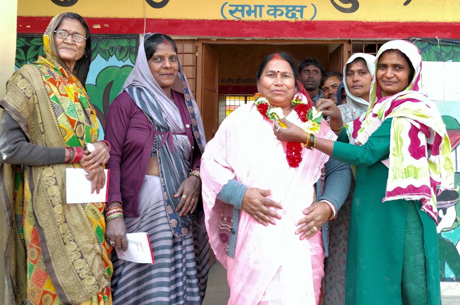 प्रधान हेमलता पटेल का स्वागत करतीं महिलाएं।