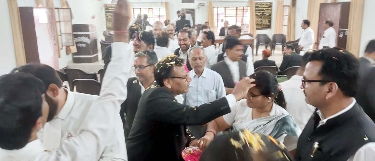 एक-दूसरे को अबीर-गुलाल लगाकर पर्व की बधाई देते अधिवक्ता।