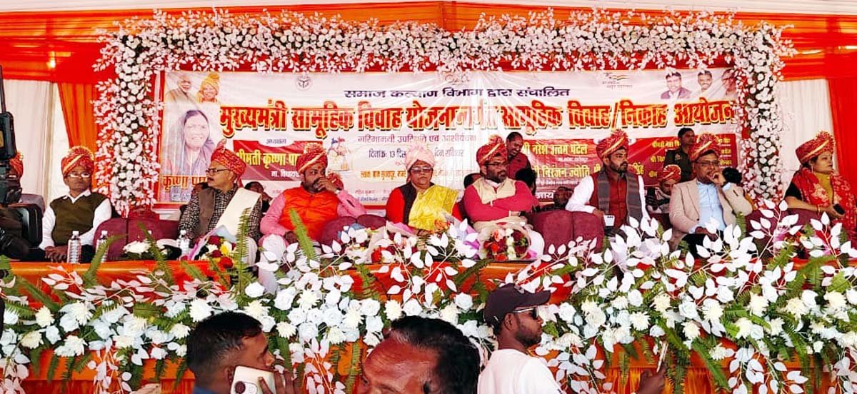 सामूहिक विवाह समारोह में जनप्रतिनिधियों ने नवविवाहित सभी जोडों को आशीर्वाद एवं वैवाहिक समाग्री का वितरण किया। प्रत्येक जोड़े को शासकीय उपहार के रूप में वधु हेतु पांच साडी ब्लाउज सहित पांच पेटीकोट, चुनरी, चांदी की बिछिया, चांदी की पायल, वैनिटी किट, लाल चूड़ी दो दर्जन, कंगन चार पीस, सिन्हौरा वर हेतु पैन्ट शर्ट का कपड़ा, फेटा/मगछा, डिनरसेट, पांच लीटर का प्रेशर कुकर, कढ़ाही, ट्रॉली बैग, दीवाल घड़ी, सीलिंग फैन, आयरन प्रेस, कूल केज (10 ली०), डबल बेड का चद्दर, पिलो कवर, कंबल दो नग, गद्दा दो कवर सहित, तकिया दो, इन्सुलेटेड हॉट स्पॉट व मिठाई एवं ड्राई फ्रूट आदि सामग्री का वितरण किया। कार्यक्रम स्थल ग्राम सधुवापुर मजरे पौली स्थित प्लान्ट मैदान वि०ख० धाता में कृष्णा पासवान विधायक खागा, ब्लाक प्रमुख धाता, ब्लाक प्रमुख विजयीपुर, अध्यक्ष नगर पंचायत खागा, अध्यक्ष नगर पंचायत धाता, अध्यक्ष नगर पंचायत किशनपुर, अध्यक्ष नगर पंचायत खखरेरू, प्रवीण पाण्डेय राष्ट्रीय अध्यक्ष बुंदेलखंड राष्ट्र समिति, आदित्य त्रिवेदी, विमलेश पाण्डेय, दीपक पासवान, अपर जिलाधिकारी (वि०/रा०), उपजिलाधिकारी खागा, परियोजना निदेशक डी०आर०डी०ए०, जिला पंचायतराज अधिकारी, खण्ड विकास अधिकारी धाता, खण्ड विकास अधिकारी विजयीपुर, अधिशाषी अधिकारी नगर पंचायत खागा, अधिशाषी अधिकारी, नगर पंचायत धाता, अधिशाषी अधिकारी, नगर पंचायत किशनपुर, अधिशाषी अधिकारी, नगर पंचायत, खखरेरू फतेहपुर, कार्यक्रम स्थल द रायल गोर्डेन मैरिजहाल हसवा मोड वि०ख० हसवा में विकास पासवान ब्लाक प्रमुख हसवा, जिला विकास अधिकारी, उपनिदेशक कृषि, तहसीलदार सदर, खण्ड विकास अधिकारी हसवा, एवं कार्यक्रम स्थल अनु श्री मैरिज लॉन जगतपुर आदिल नियर सातमील वि०ख० भिटौरा में अमित तिवारी ब्लाक प्रमुख भिटौरा, अजय सिंह उर्फ रिंकू लोहारी जिला पंचायत सदस्य, राम किशोर जिला पंचायत सदस्य, अभिजीत भारती अध्यक्ष अनुसूचित जाति मोर्चा, अपर जिलाधिकारी (न्यायिक), उपजिलाधिकारी सदर, उपायुक्त मनरेगा, उपायुक्त स्वतः रोजगार, खण्ड विकास अधिकारी भिटौरा ने पहुंच कर सभी नवदम्पतियों को आशीर्वाद एवं शुभकामनाएं दी। सभी विवाहित जोड़ों को विवाह प्रमाण पत्र देकर मुख्यमंत्री सामूहिक विवाह योजना की प्रशंसा की और कहा कि सभी नवदम्पत्ती आपस में प्रेम भाव एवं आपसी सहयोग से रहें।