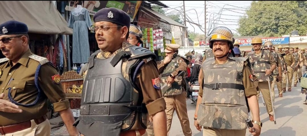 भीड़ भाड़ वाले इलाके में फ्लैग मार्च की अगुवई करते एएसपी व सीओ।