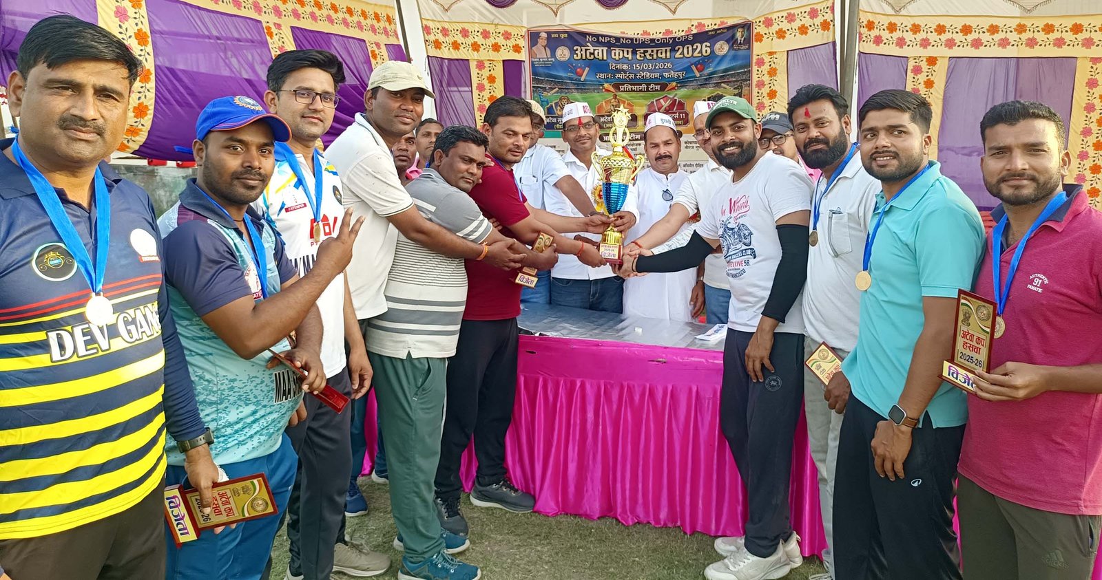 फतेहपुर(CNF)। अटेवा पुरानी पेंशन बचाओ मंच हसवा के तत्वाधान में अटेवा कप हसवा 2026 का आयोजन किया गया। जिसमें अटेवा वारियर्स, अटेवा काईटर्स, अटेवा ब्लैक पैंथर्स, अटेवा सुपर स्ट्राइकर की टीम ने प्रतिभाग किया। अटेवा वॉरियर्स एवं अटेवा अटेवा फाइटर्स ने सेमीफाइनल में जीत कर फाइनल में प्रवेश किया। टूर्नामेंट के प्लेयर ऑफ द टूर्नामेंट मुकेश द्विवेदी रहे। फाइनल में अटेवा फाइटर ने पहले खेल कर 59 रनों का लक्ष्य दिया। जिसे अटेवा वारियर्स ने 6 ओवर में चेस करके फाइनल जीत लिया। इस टूर्नामेंट में अवधेश पाल के कप्तानी में अटेवा वॉरियर्स ने शानदार पारी की। सेमीफाइनल मैच में मुकेश द्विवेदी ने 149 रनों की पारी खेलकर कीर्तिमान बनाया और मैन ऑफ द टूर्नामेंट बने इस टूर्नामेंट में अटेवा जिलाध्यक्ष निधान सिंह, जिला महामंत्री महेंद्र मौर्य, जिला कोषाध्यक्ष देवेंद्र पांडेय, जिला संगठन मंत्री हेमचंद चैधरी, जिला सोशल मीडिया प्रभारी अरविंद विश्वकर्मा, हसवा टीम ब्लॉक अध्यक्ष सुमित शर्मा, महामंत्री अरुणेंद्र कुमार, ब्लॉक उपाध्यक्ष महेंद्र वर्मा, नीरज गुप्ता, हर्षित कुमार, अखण्ड प्रताप सिंह, तहसील प्रभारी संदीप यादव, विनय सिंह, देवेंद्र सिंह, ज्ञानेश भूषण बिंदकी तहसील प्रभारी अजय पाल, पुष्पेंद्र कुमार, प्यारेलाल आदि उपस्थित रहे।